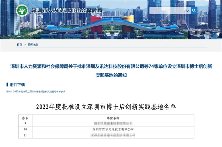 近日,由深圳市人力資源和社會保障局組織開展的2022年度博士后創新實踐基地設立工作圓滿結束,經單位申報、專家評審、網絡公示等程序,74家單位獲批深圳市博士后創新實踐基地,安華光電成功入選,開啟構筑人才集聚高地的新篇章。